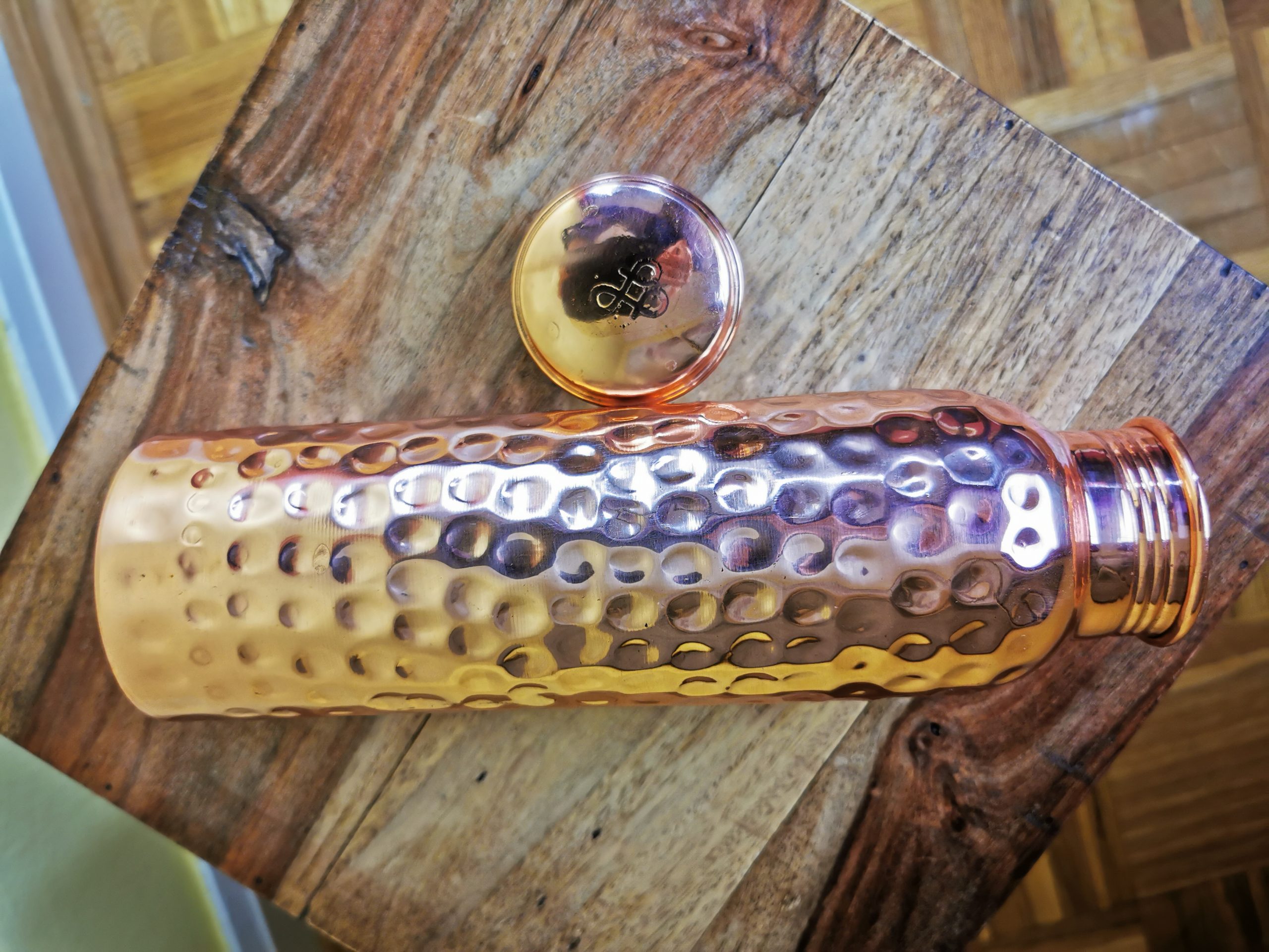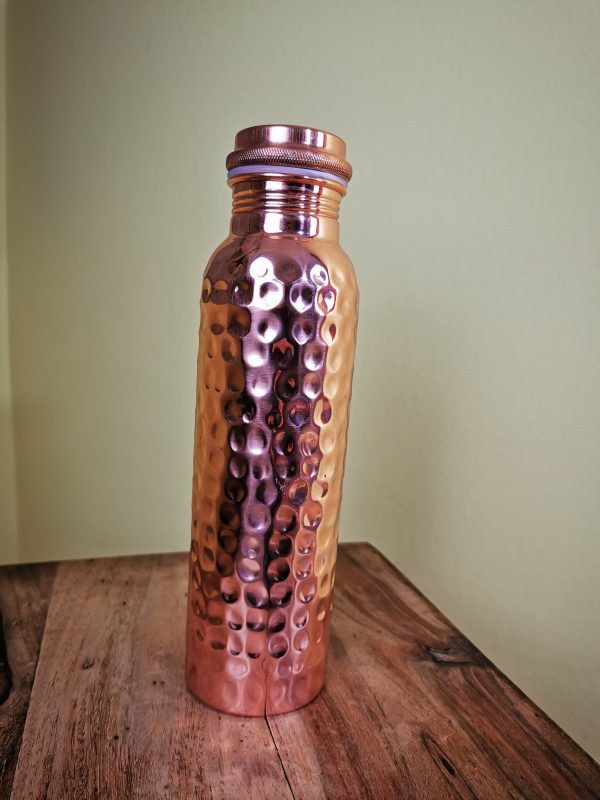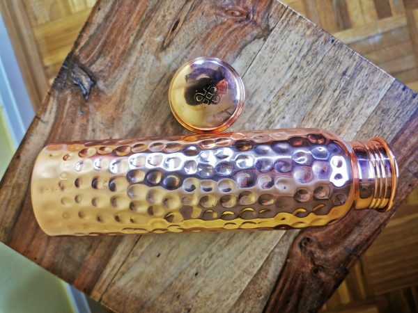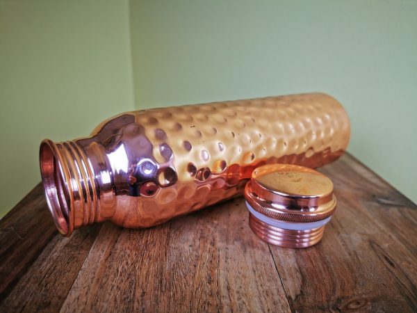 Kupferwasserflasche, gehämmert, 950 ml. Die Flasche ist ein einzigartiges Kunsthandwerk! Ayurveda trifft Kupfer!